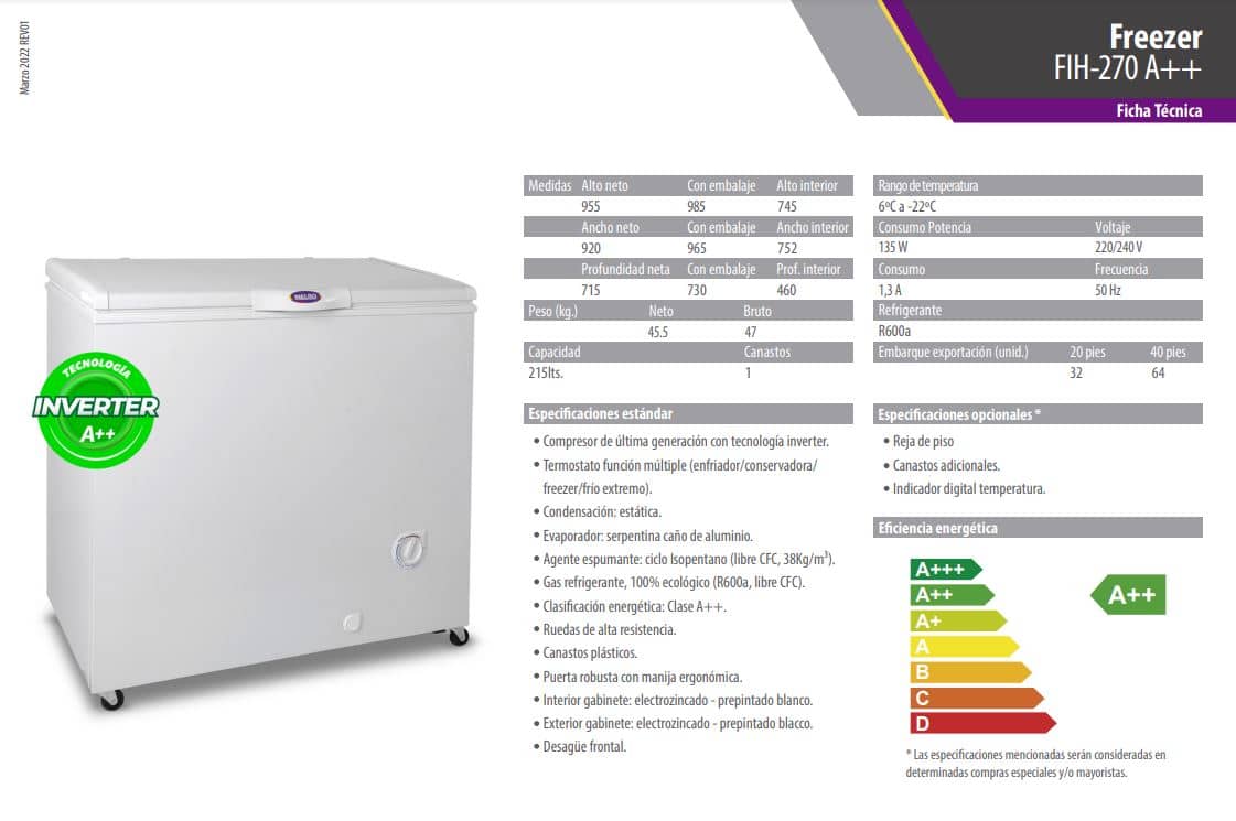 Freezer Full-4 Funciones de Frío. Nuevo tablero, Un Canasto, Ruedas Giratorias de alta resistencia, Interior en chapa pre pintada blanca, Desagote Frontal. Refrigerante R600a. Eficiencia Energética A++