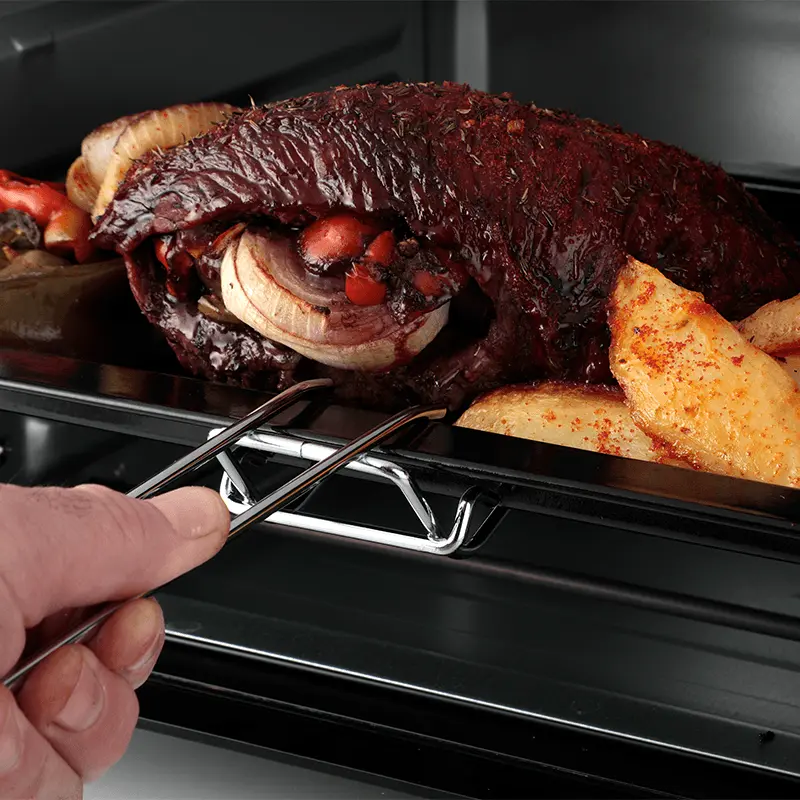 Este horno de diseño compacto y eficiente cuenta con una capacidad total de 40 litros, es ideal para quienes buscan un electrodoméstico de gran rendimiento en espacios reducidos. Su peso neto es de 7.8 kg y opera a un voltaje de 220-240V, con una potencia de 1600W, ofreciendo un alto rendimiento con una clasificación de eficiencia energética Clase B.