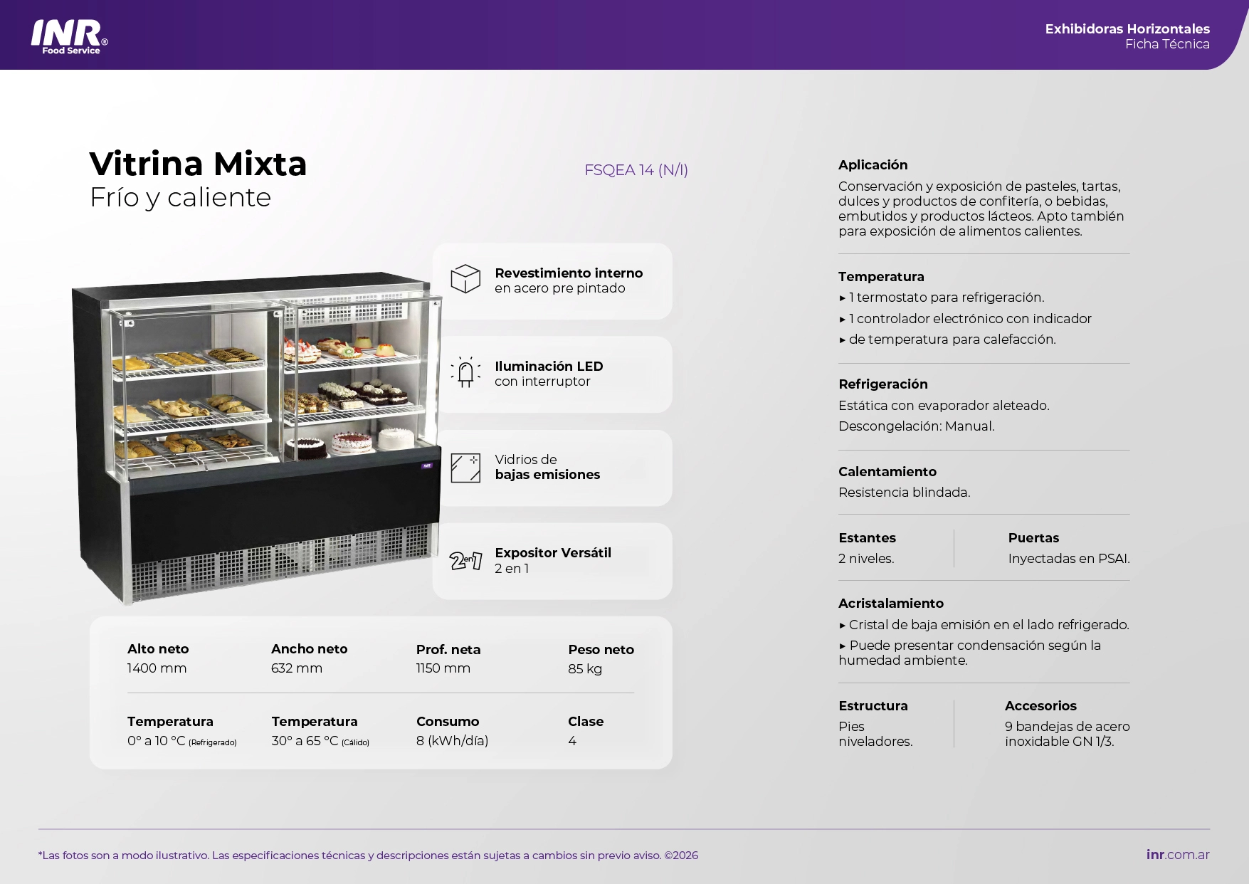 Vitrina mixta de exhibición comercial, ideal para panaderías, cafeterías, rotiserías y locales gastronómicos. Combina en un solo equipo una sección refrigerada y una sección caliente, permitiendo exhibir y conservar distintos tipos de alimentos simultáneamente. Cuenta con estructura vidriada frontal, estantes regulables, iluminación interna y controles de temperatura independientes para cada zona. Su diseño funcional y moderno optimiza el espacio de venta y mejora la presentación de productos fríos y calientes, manteniendo su calidad y frescura.